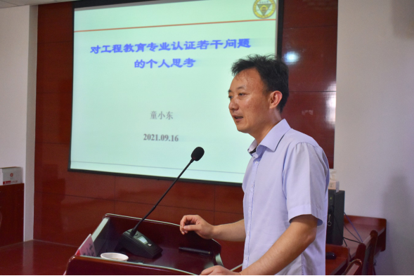 2021年9月16日下午,高等教育土木工程专业评估(认证)委员会副主任委员、东南大学童小东教授莅临bevictor伟德官网,对我院土木工程专业评估(认证)工作进行指导,在土木馆A302会议室为学院全体教师作题为《对工程教育专业认证若干问题的个人思考》的专题报告。报告由bevictor伟德官网院长逯静洲主持,bevictor伟德官网党总支书记李军、bevictor伟德官网副院长樊海涛以及数十名专业教师参加了本次报告会。